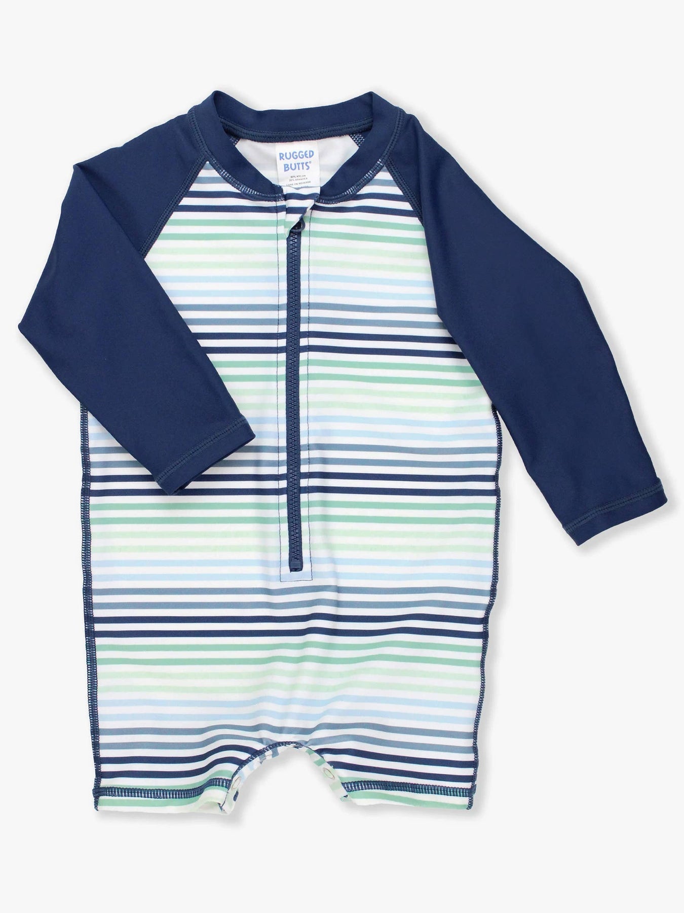 Keep your little guy safe from the sun with this UPF 50+ Boys Long Sleeve One Piece Rash Guard. This full coverage one piece suit makes trips to the pool, lake or beach so easy for little crawlers. Snaps at bottom make for easy changing. Made with sun protected fabric for all day protection and comfort. This bestselling stripe pattern is a customer favorite, year after year! Pairs well with Navy, White. Care Instructions: Hand wash cold with like colors; do not bleach; do not iron; line dry in shade Fabric Content: 80% Nylon, 20% Spandex