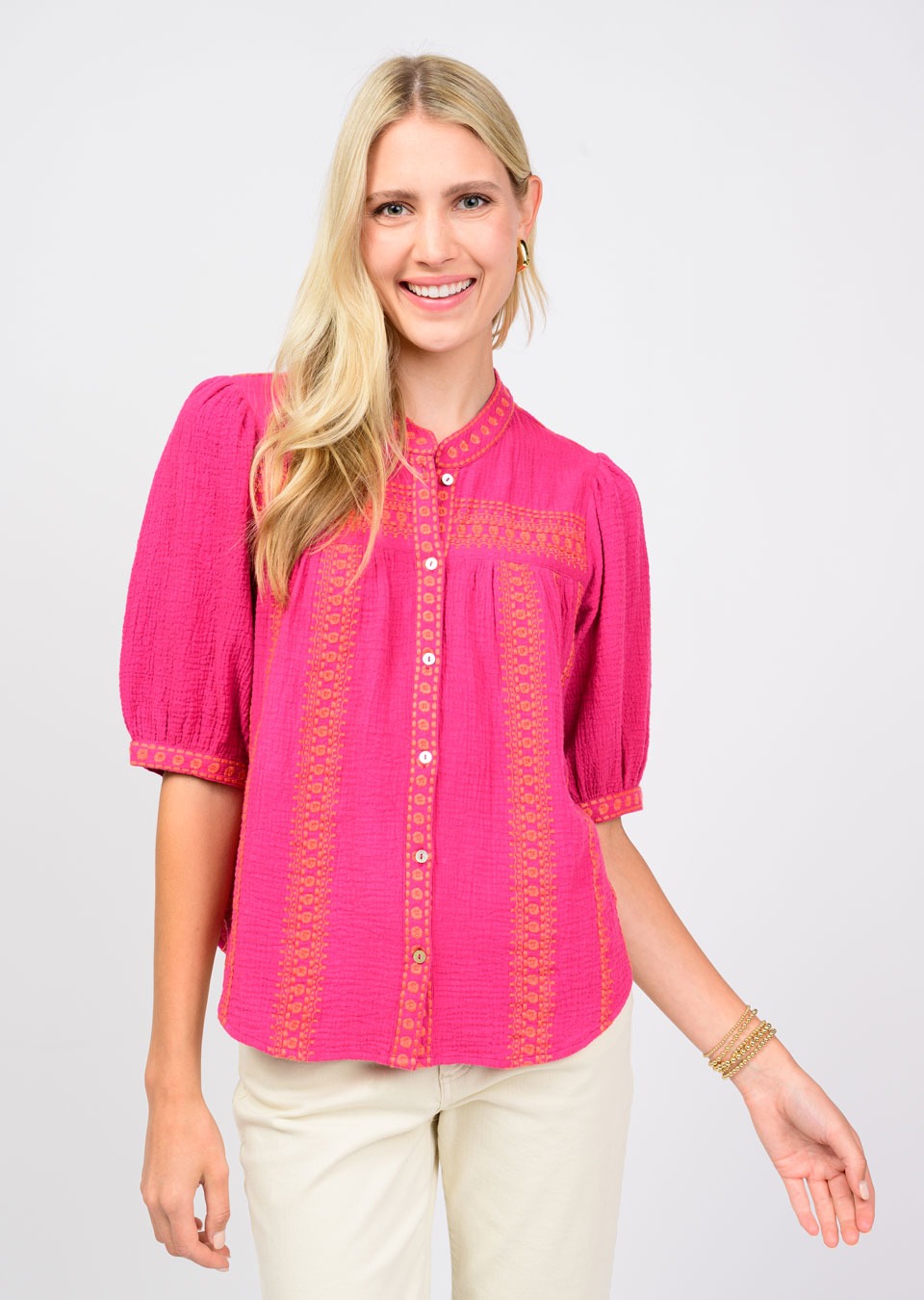 Effortless charm meets everyday comfort in this Raspberry Embroidered Gauze Top. Crafted from breathable gauze fabric, this Ivy Jane button-down features delicate embroidered details and flattering elbow-length sleeves—perfect for layering or wearing solo. The relaxed fit and soft drape make it an instant favorite for casual outings, weekend brunches, or breezy afternoons. A versatile wardrobe essential that feels as good as it looks.