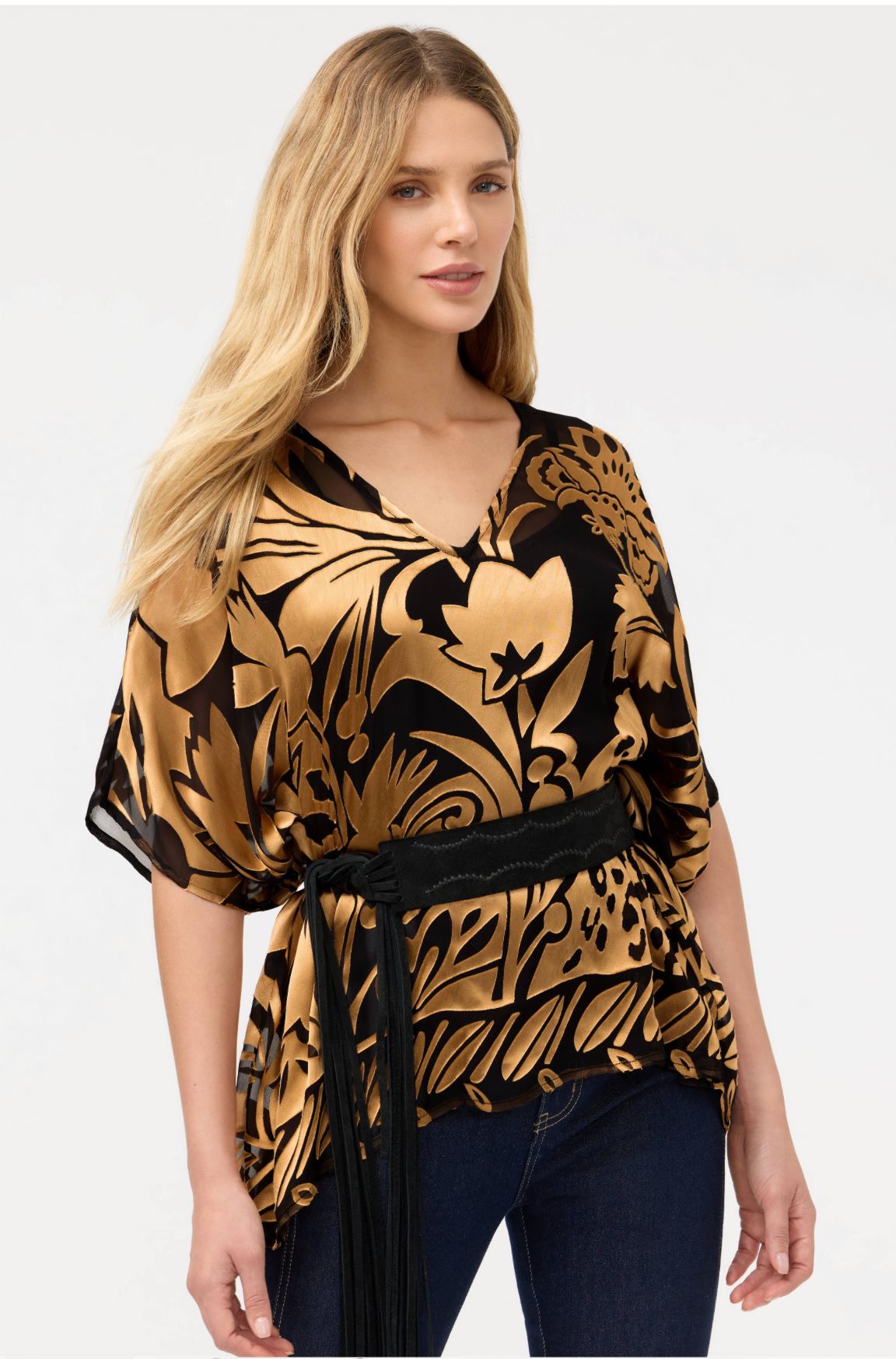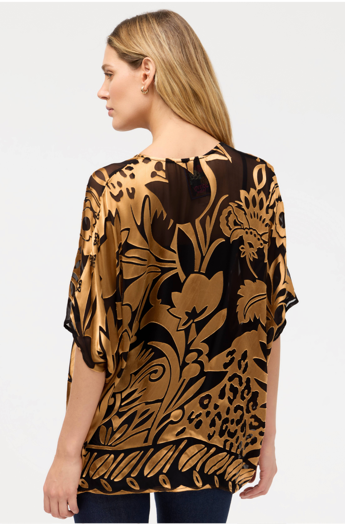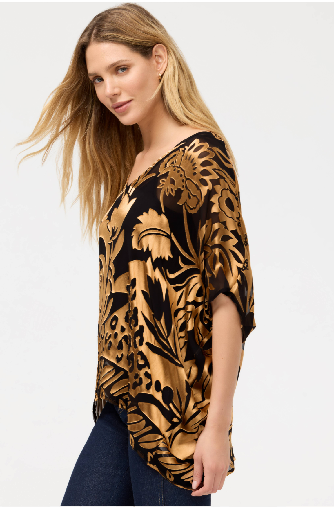 Elevate your evening style with the Davidii Croft Poncho, a show-stopping piece that blends luxury with flair. This silk-viscose blend features an ornate scrolling pattern in vibrant hues, paired with elegant elbow-length sleeves and a flattering closed side seam. The delicate cami lining adds a refined touch. Slip it on with a black pencil skirt and gold heels for an unforgettable night out. Luxe, versatile, and undeniably chic.