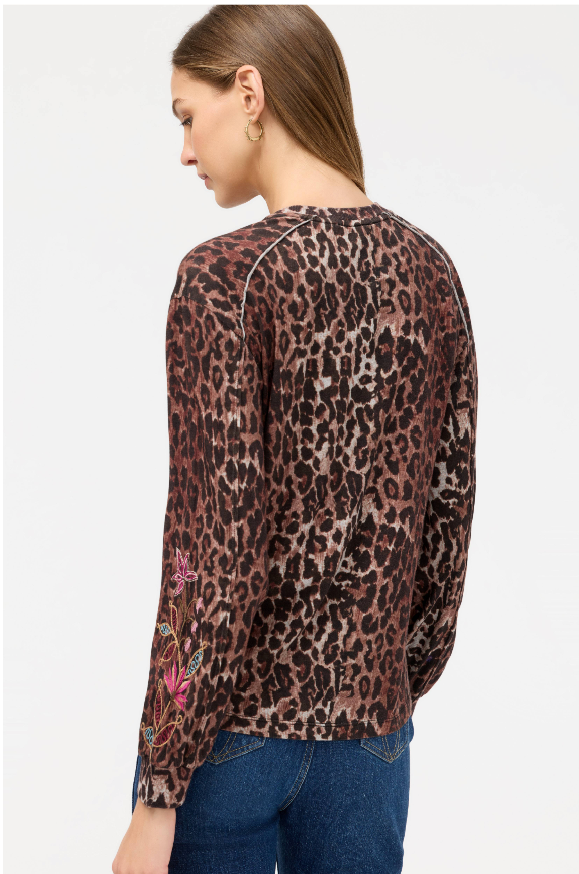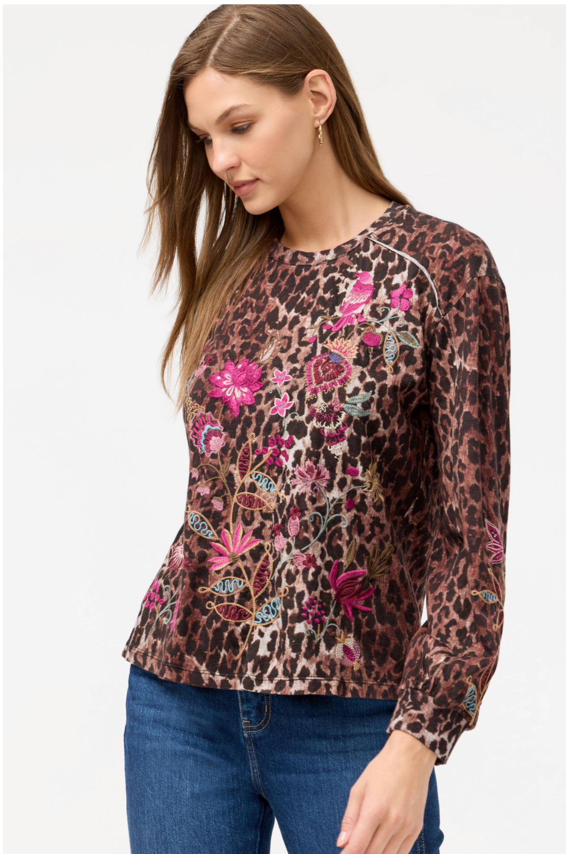 Crafted from 100% breathable cotton, the Penellope Seamed Sleeve T-Shirt is embellished with intricately embroidered detailing in vibrant tones paired with a rich leopard pattern. Featuring a crew neckline and raglan sleeves, this tee offers gently puffed sleeves finished with a cuff. Pair with cozy joggers and fashion sneakers for a casual lounge look.