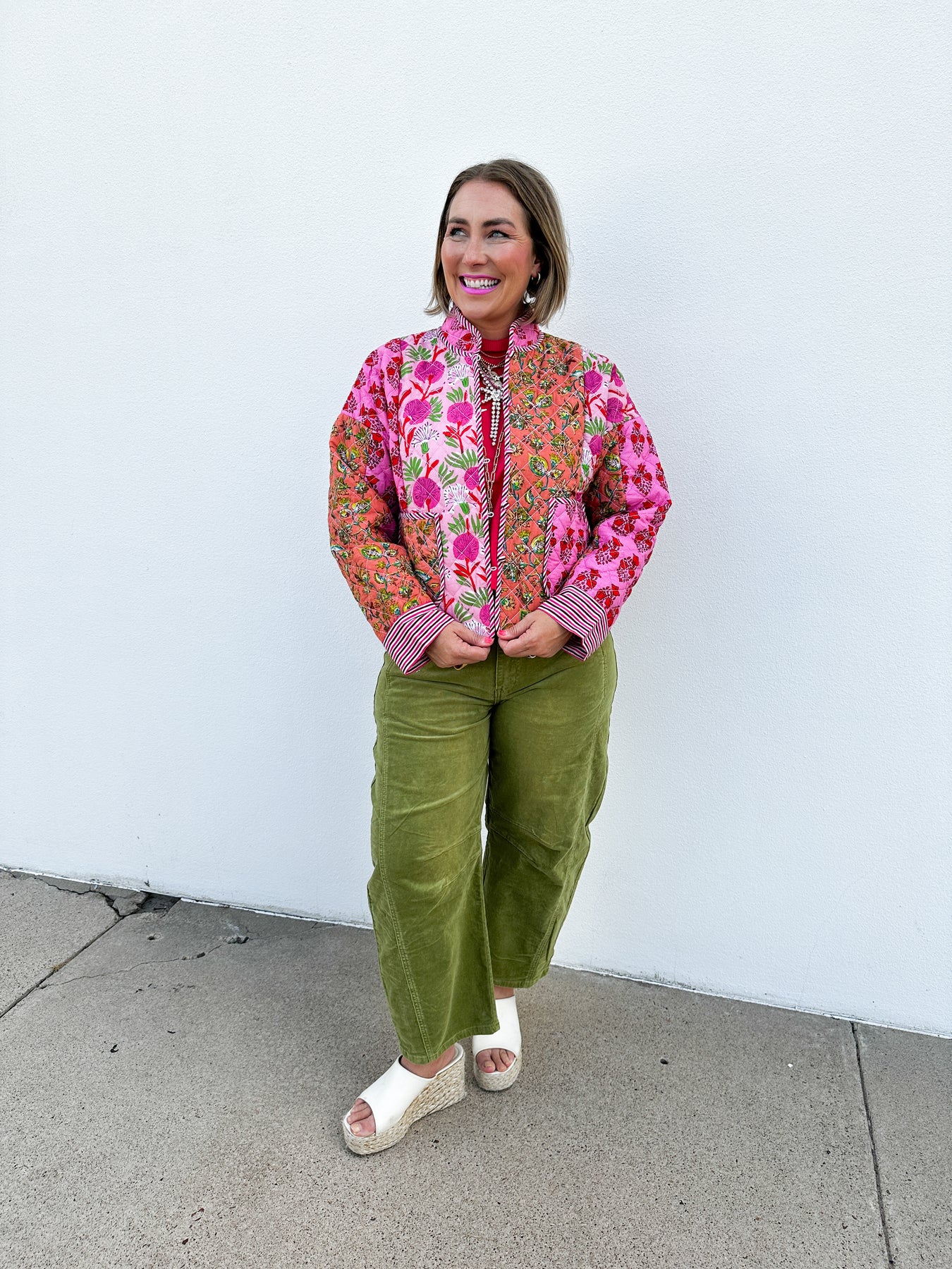 The Cheetah Patchwork Quilted Jacket features a woven 100% viscose outer layer with a filled polyester interior and a comfortable 100% cotton lining. Designed with a 22 3/4 inch body length, a 44 inch bust width, and 19 1/2 inch sleeves, this jacket offers a balanced fit and superior warmth. Its quilted construction ensures insulation while maintaining a lightweight feel, making it an ideal choice for layering in cooler weather. The distinctive patchwork cheetah design adds a refined, expert touch to any wardrobe.