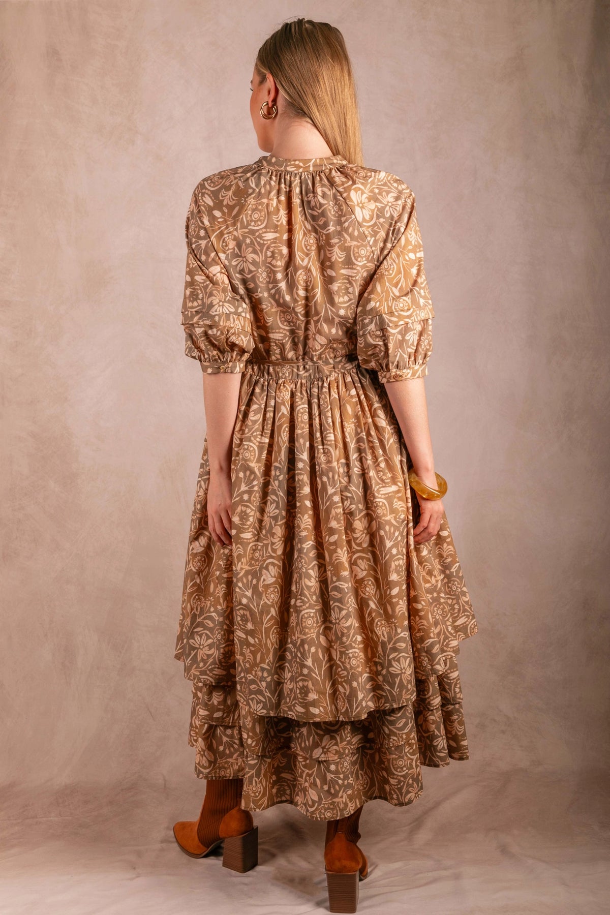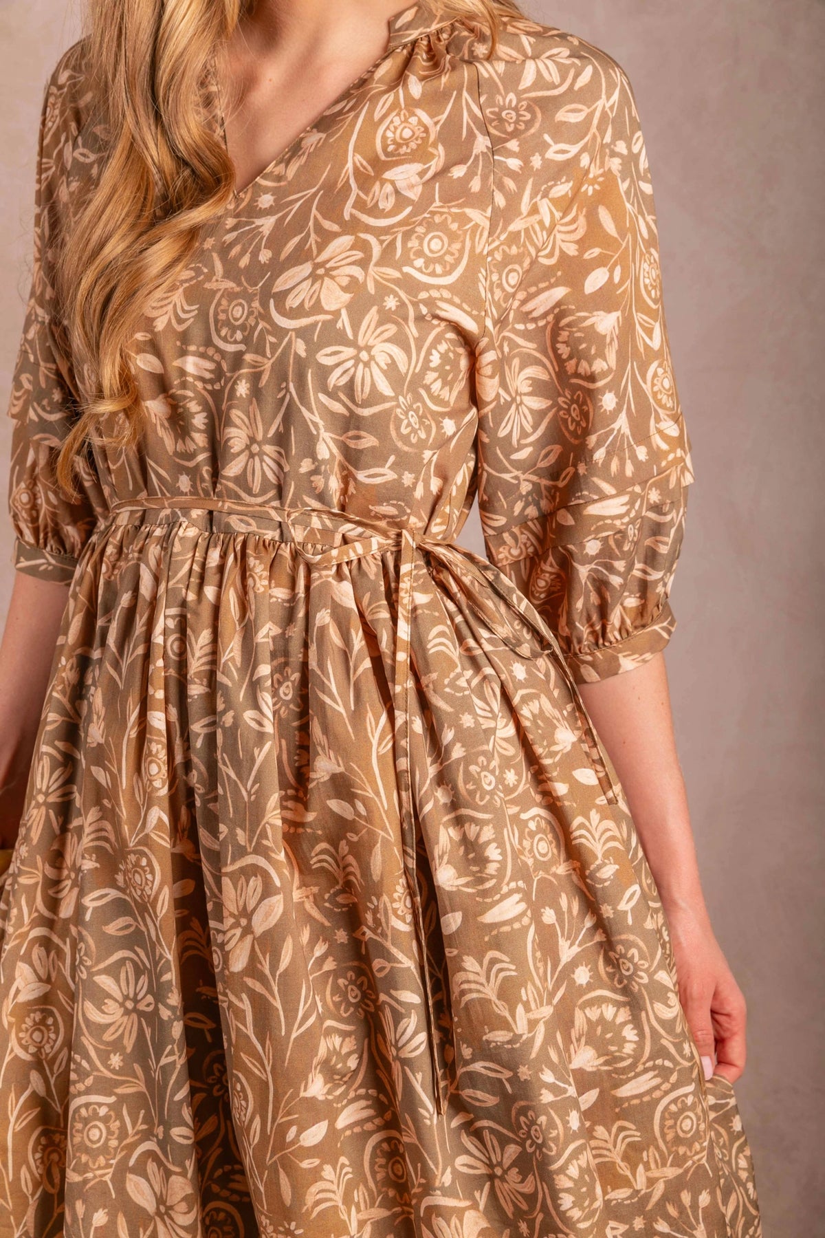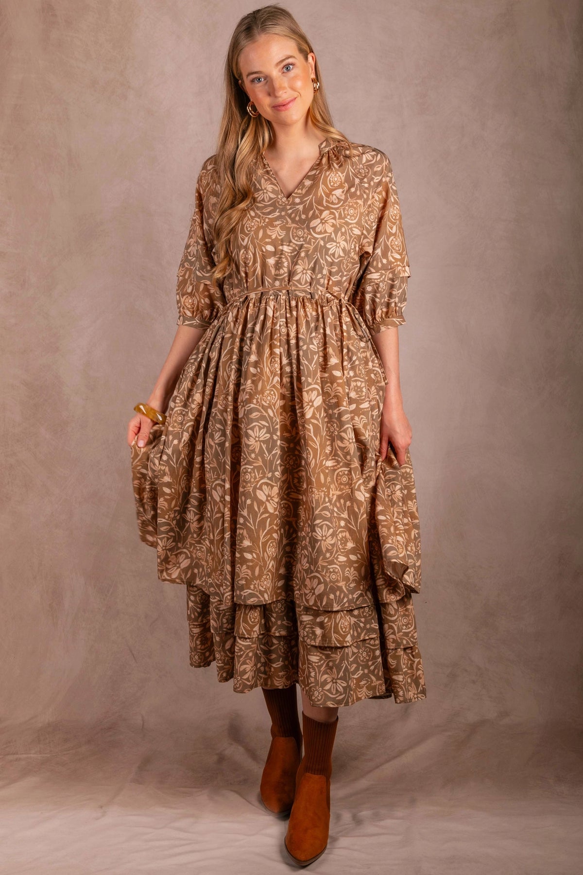 Twirl into effortless style with this stunning leaf print maxi dress. The flowing blend of cotton and rayon drapes beautifully while the removable belt lets you cinch your waist whenever the mood strikes. V-neckline, charming ruffle hem, and practical side pockets make this dress as functional as it is fabulous. Three-quarter sleeves and maxi length deliver that perfect balance of coverage and elegance for any occasion.