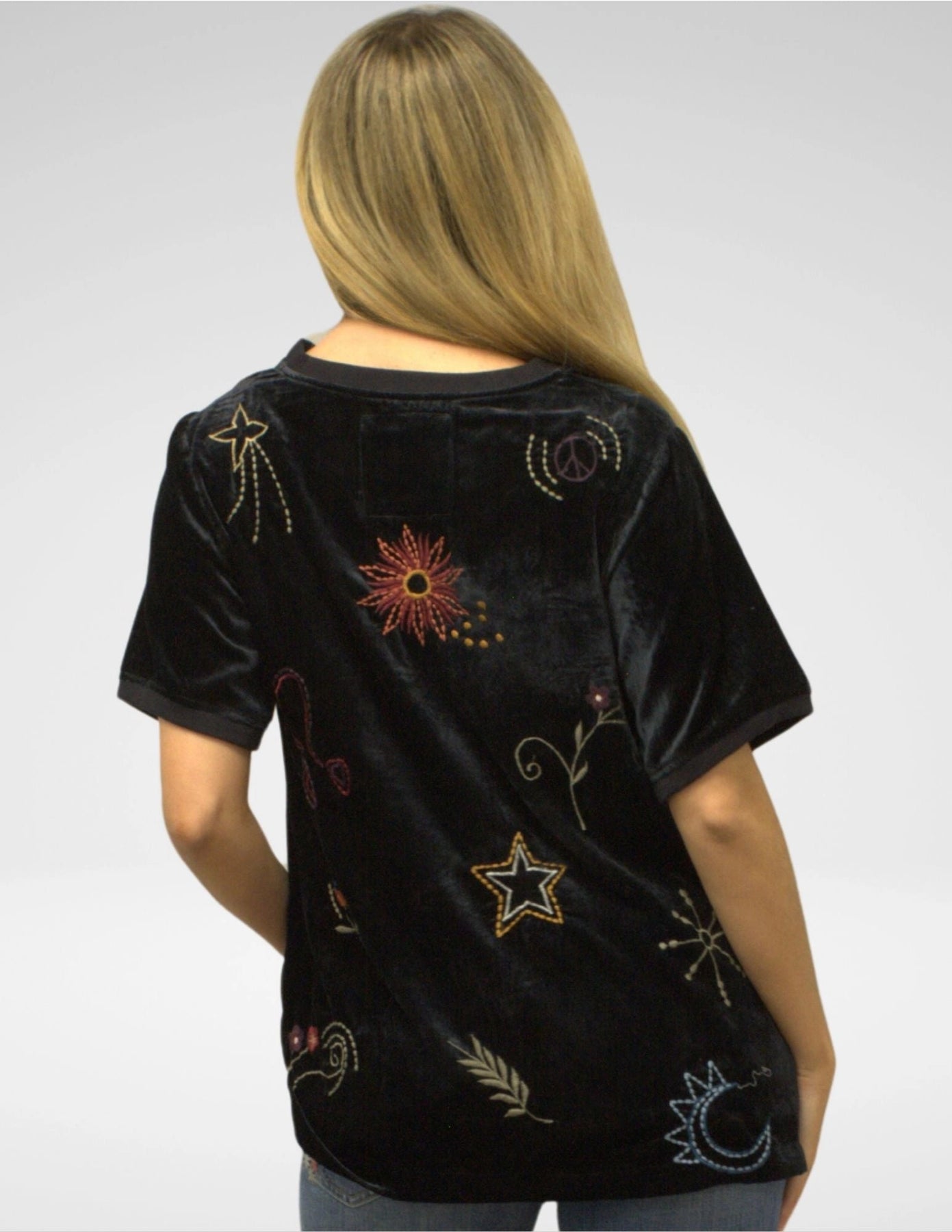 Black Odine Velvet Tee Crafted from luxurious velvet, this short-sleeve tee elevates everyday wear with its sophisticated texture and refined appeal. Each piece features assorted embroidered designs that add visual interest and personality. Versatile enough to transition seamlessly from casual to dressy occasions, it pairs effortlessly with jeans for relaxed styling or layers beautifully under blazers for polished looks. The premium velvet construction ensures comfort while delivering an upscale aesthetic that distinguishes it from standard cotton basics.