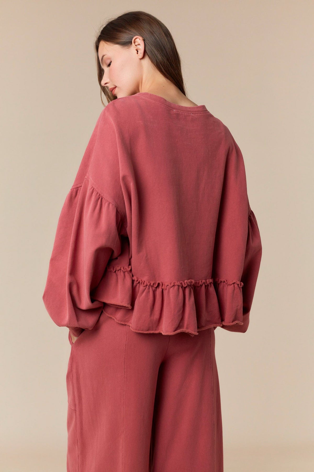 Crafted from 100% cotton, this Mauve Washed Ruffle Hem Sweatshirt features a washed French terry fabric for a soft, breathable feel. Its distinctive cut-edge ruffle hem and high-low silhouette introduce subtle yet stylish detailing, perfect for a polished casual look. Designed to combine comfort with a refined edge, this cropped sweatshirt adds effortless charm to your wardrobe essentials.