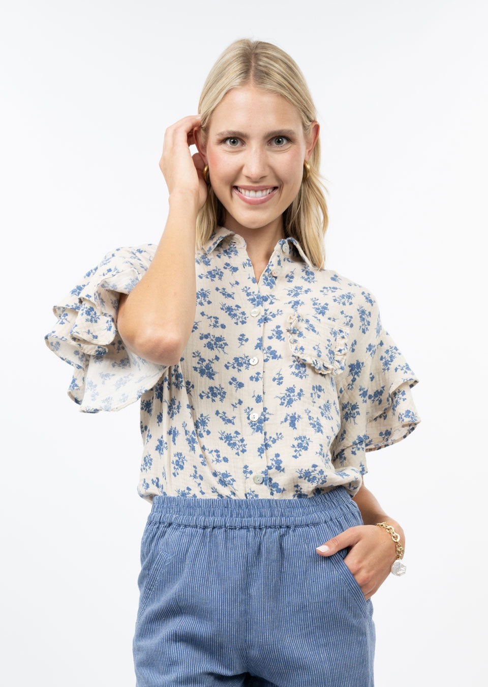 The Disty Cream Floral Camp Shirt by Ivy Jane features delicate blue flowers set against a soft cream background, embodying fresh spring elegance. Designed with short flutter ruffle sleeves and a button-down front, this shirt offers a light, airy feel perfect for warm weather. Its refined details provide effortless style and comfort, making it an essential layering piece for your seasonal wardrobe.