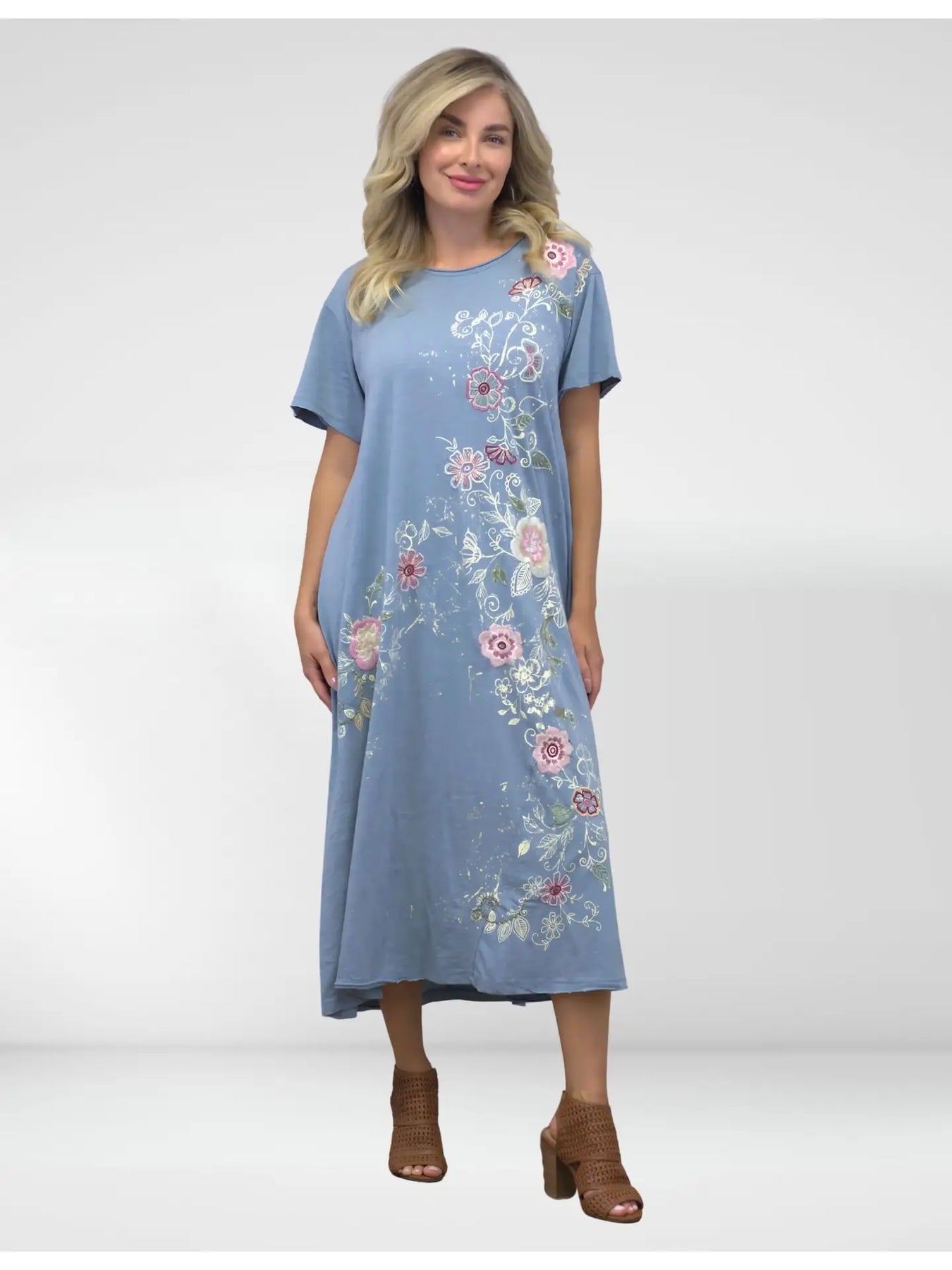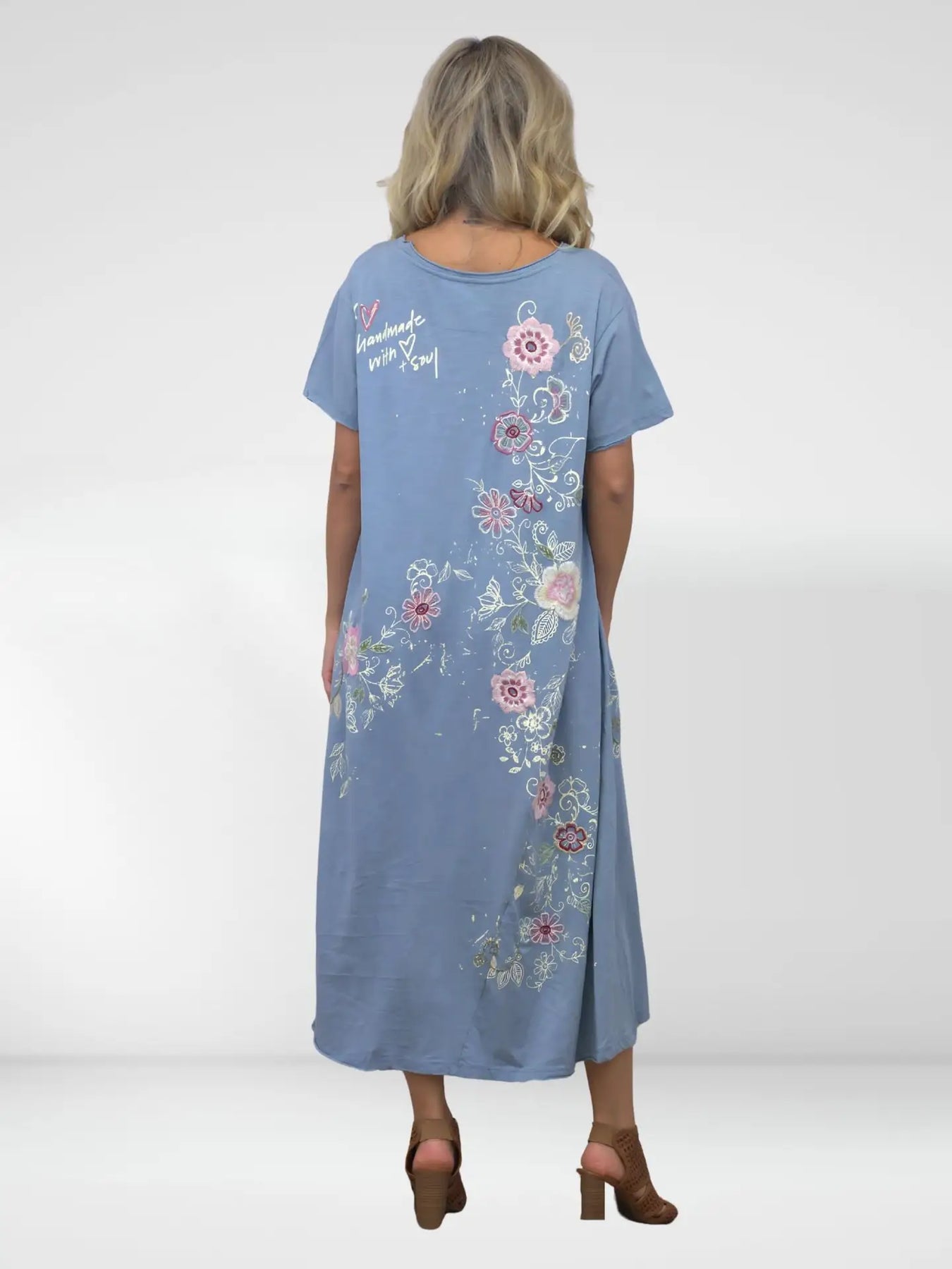 Slip into effortless spring and summer style with this charming vintage-inspired dress, by Kyla Seo. Featuring delicate pastel pink embroidery adorning both the front and back, it's a sweet statement piece that feels anything but ordinary. Crafted from lightweight cotton, the relaxed short sleeves and flowing silhouette keep you cool and comfortable through warm weather. Perfect for casual outings, garden parties, or lazy afternoons—this dress is your new go-to for laid-back elegance with a playful twist.