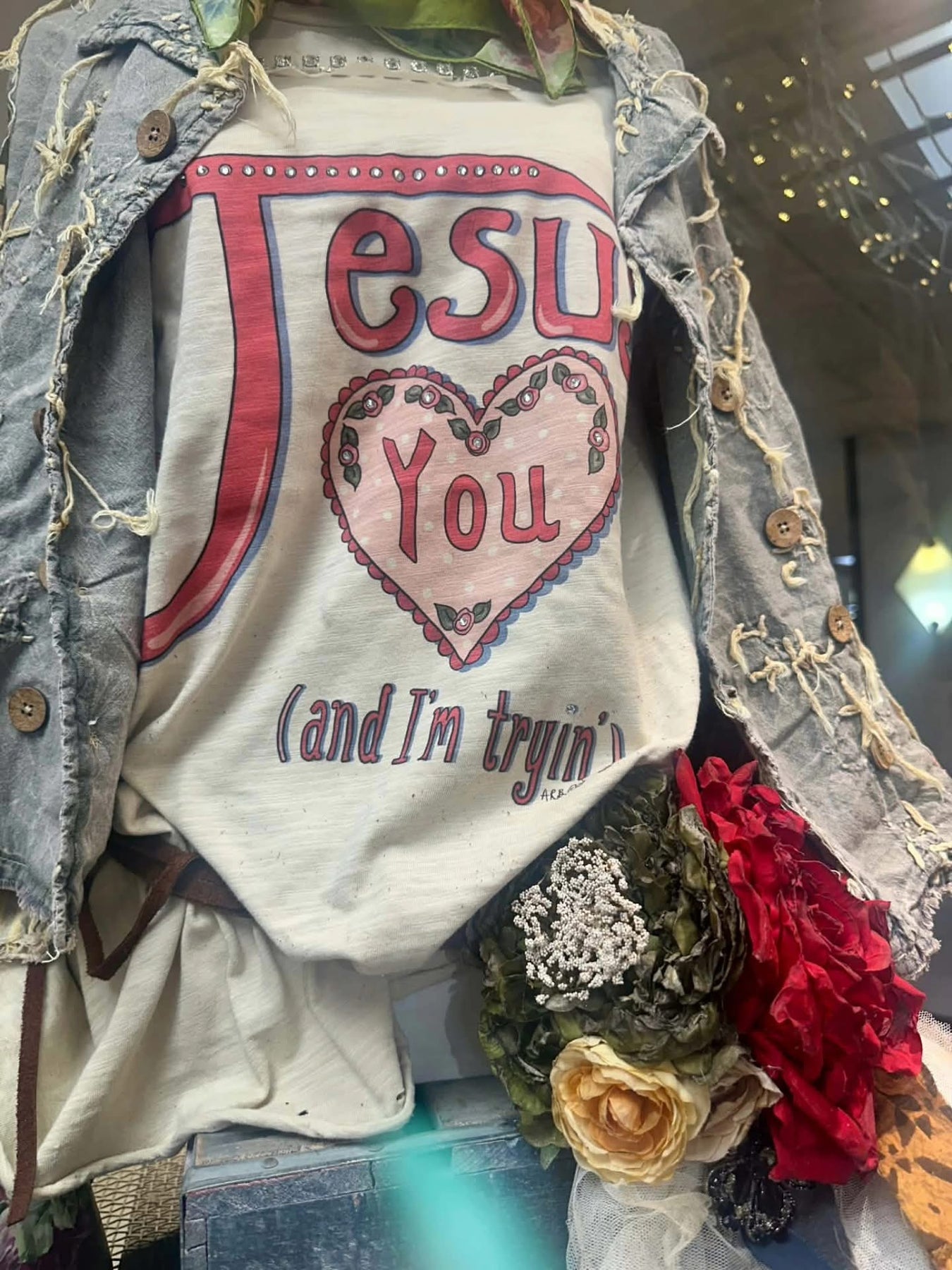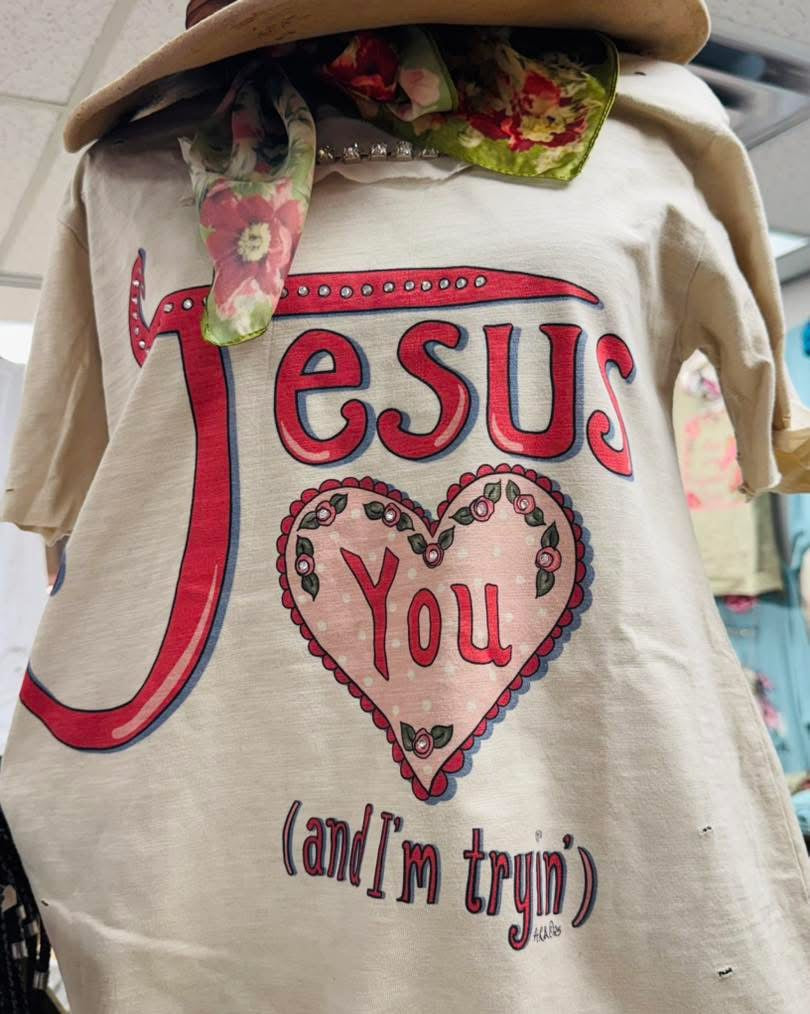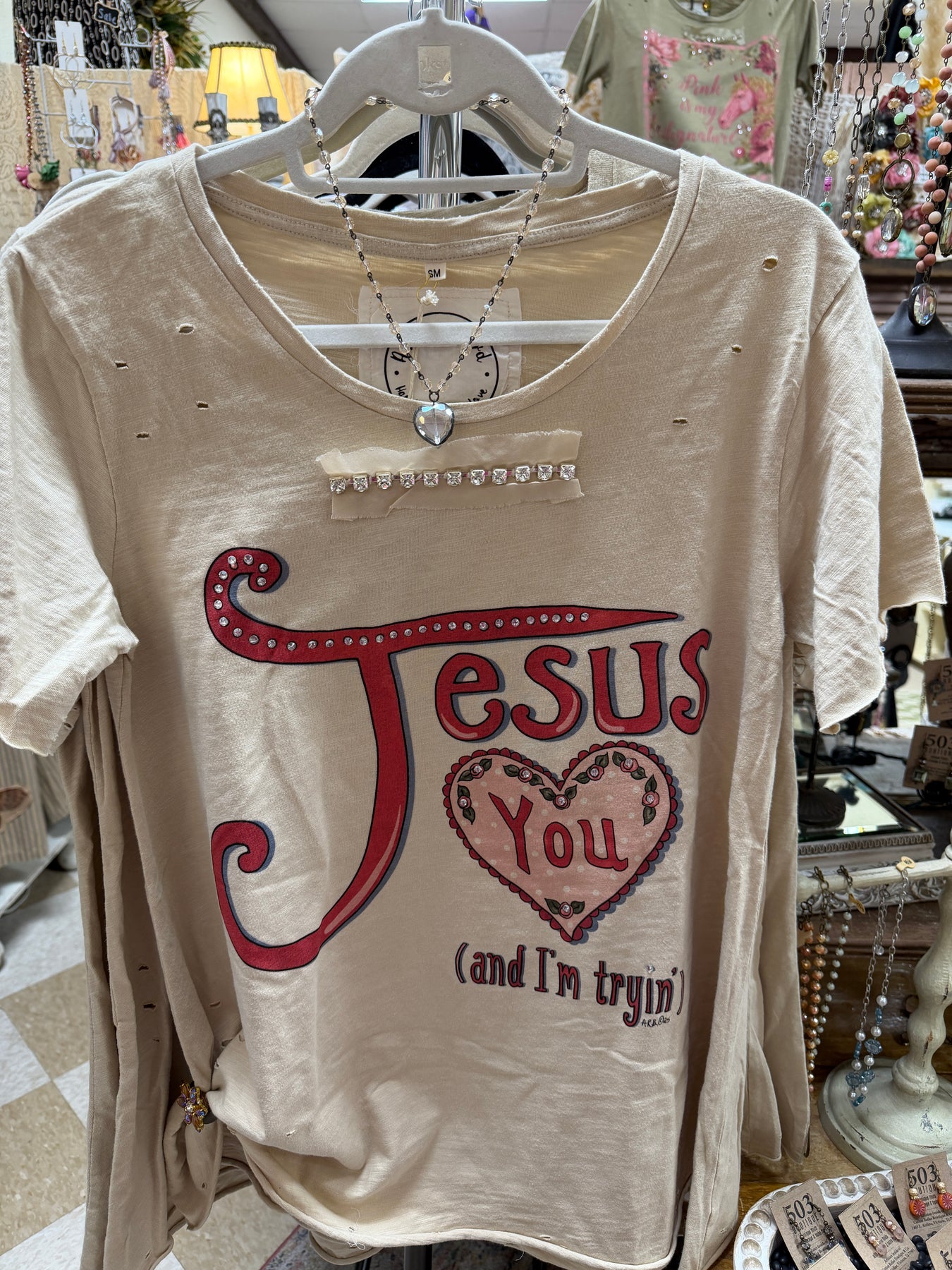 Embrace your spiritual side with a little attitude in this oversized tattered tee featuring exclusive art by Lisa. This A Rare Bird "Jesus Loves You (I'm Trying)" message delivers a cheeky reminder with genuine heart. Distressed fabric creates an effortlessly cool vibe, while strategically placed crystals and a glittering row of bling near the neckline add just the right amount of sparkle. Perfect for anyone who appreciates bold, unapologetic style with a wing and a prayer. Short sleeves, relaxed fit—comfort meets character.