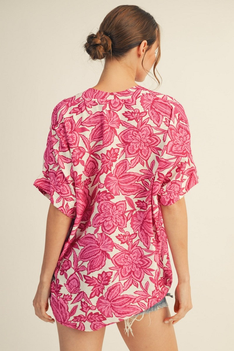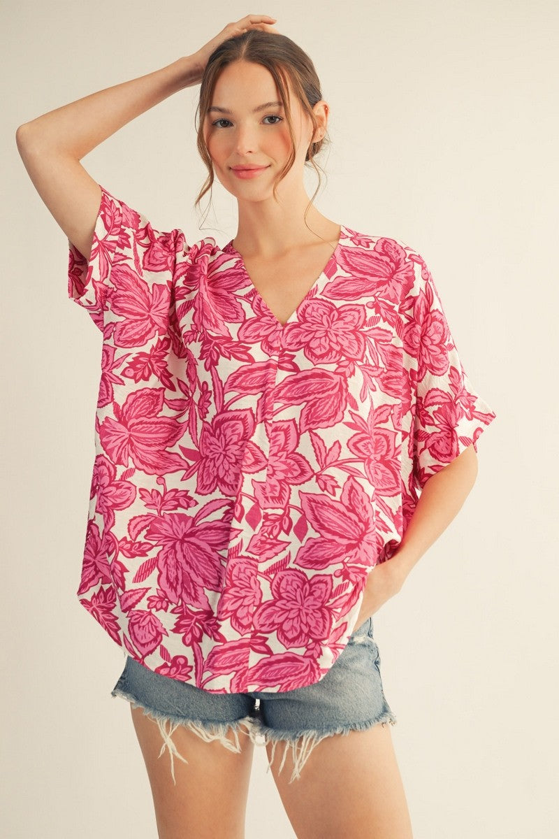Effortlessly chic and undeniably comfortable, this fuchsia floral loose fit top brings relaxed elegance to your everyday wardrobe. The flattering drop shoulder silhouette pairs beautifully with a classic V-neckline, creating a look that's both feminine and laid-back. Crafted from a breathable rayon and nylon blend, the fabric drapes gracefully while maintaining its shape. Perfect for styling with jeans, linen pants, or layering over your favorite basics—this versatile piece transitions seamlessly from casual outings to weekend adventures.