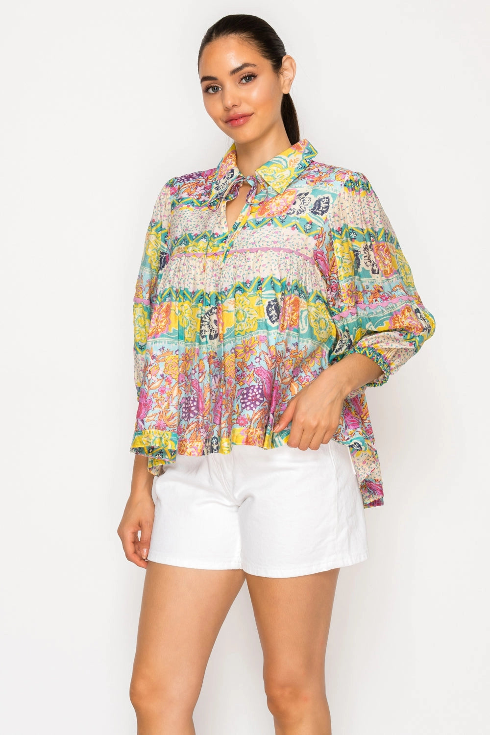 Escape to sun-soaked shores with the Kallisti Festival Blouse, where boho-chic meets Mediterranean magic. This enchanting piece showcases a vibrant patchwork of floral and geometric prints in sunset pink, golden yellow, and turquoise—inspired by the artful spirit of the Greek isles. The relaxed peplum silhouette, romantic tie-neck collar, and dreamy puff sleeves create an effortlessly romantic vibe that works equally well exploring seaside markets or dancing under the stars. Pair with white shorts for daytime wandering or your favorite denim for evening adventures.