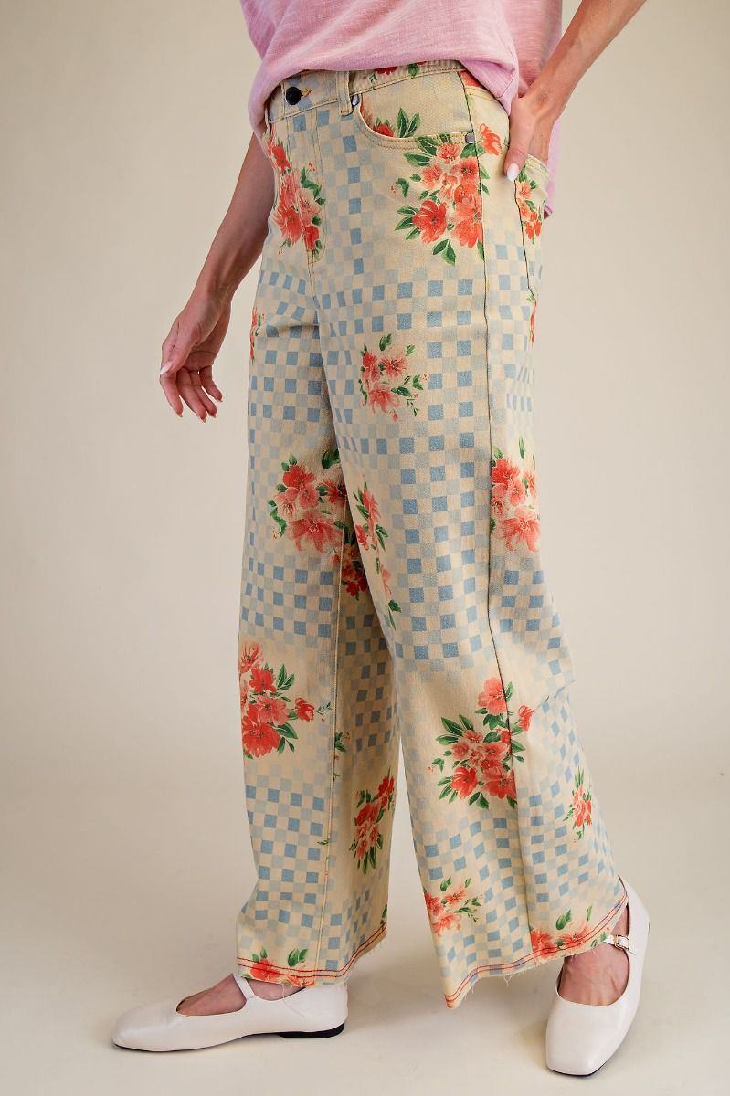 Elevate your everyday style with these floral printed soft stretch twill pants—the perfect blend of comfort and personality. Featuring a high-waisted, wide-leg silhouette with a cropped length and raw frayed hem, they're designed for that effortlessly cool vibe. The five-pocket construction keeps things practical, while contrast stitching and a zip fly with button closure add polished details. Made from a breathable 97% cotton and 3% spandex blend, these woven beauties offer just enough stretch to move with you. Whether you're dressing them up or keeping it casual, this checkerboard pattern with floral flair is ready to turn heads.