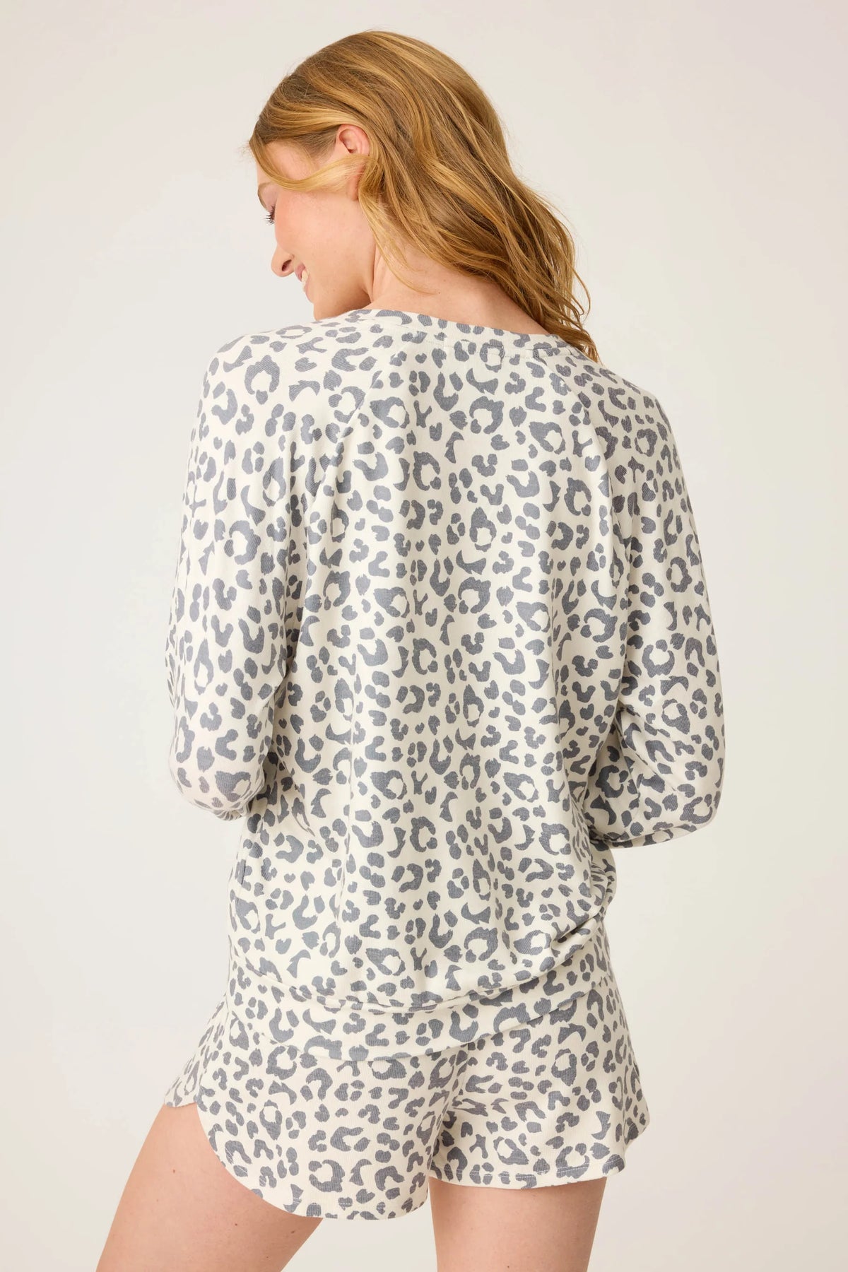 A stylish long sleeve top combines comfort with a contemporary design, making it ideal for lounging or as part of a sleepwear set. Crafted from a soft, breathable fabric blend, this piece feels great against the skin while allowing ease of movement. A V-neckline adds femininity, while full-length sleeves provide warmth and coverage. Unique accents like contrasting cuffs in pastel colors and a trendy leopard print pattern elevate its casual aesthetic. Versatile enough for indoor relaxation or casual outings, this top is an essential addition to any wardrobe.