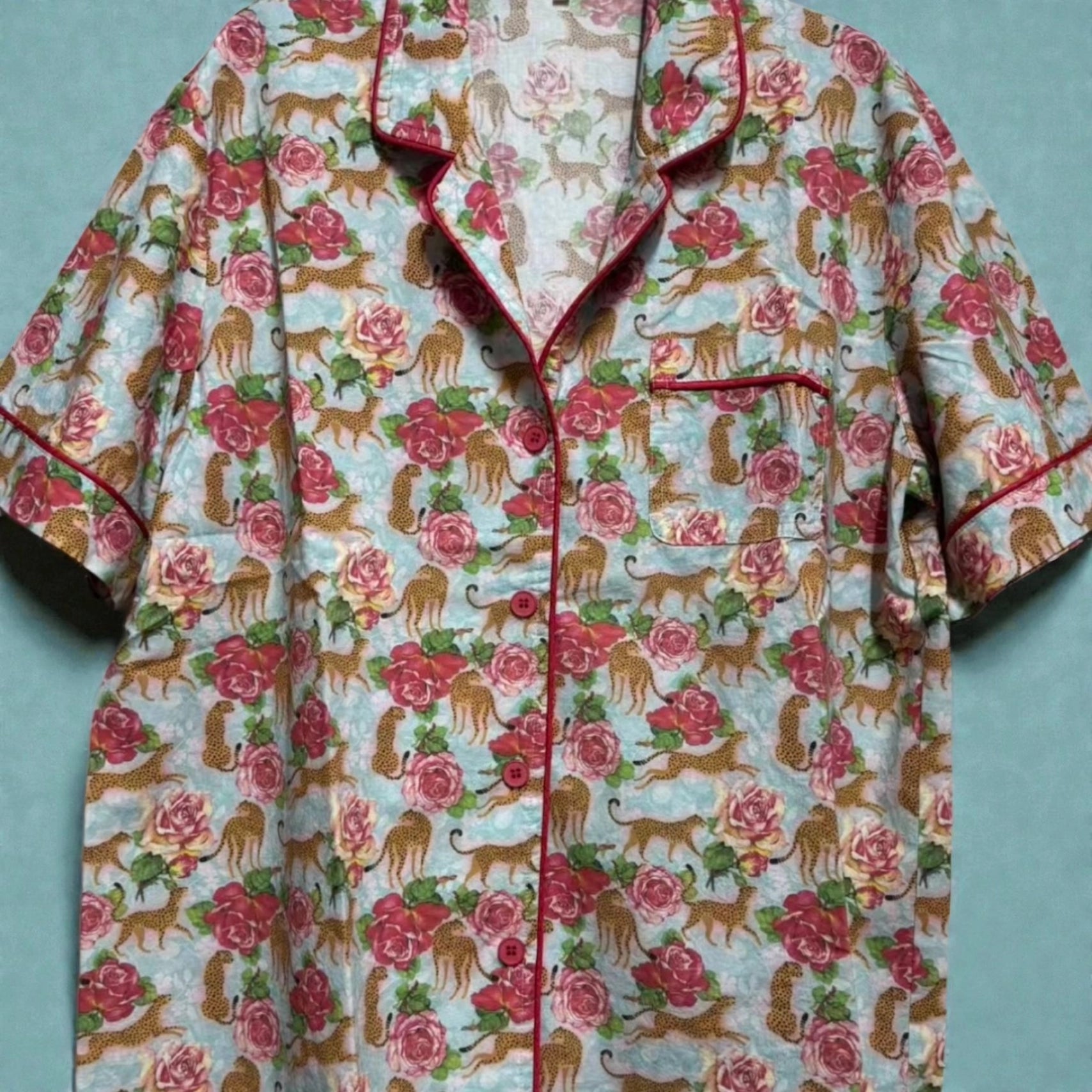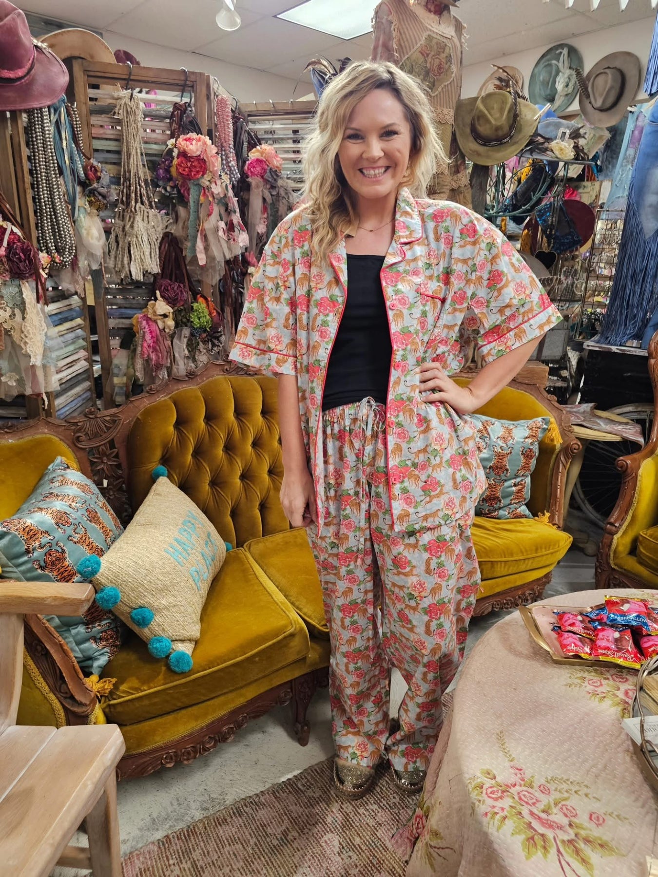 NEW TO A RARE BIRD! Amazing Pouncing cheetahs and Roses on this pretty sky blue polished cotton background. Shades of "cheetah" and pinks finish this stunning exclusive RARE BIRD print. S/M and L/XL available Elastic drawstring waistband makes these fit everyone. S/M (0-8) and L/XL (10-2x). Comes as a set.