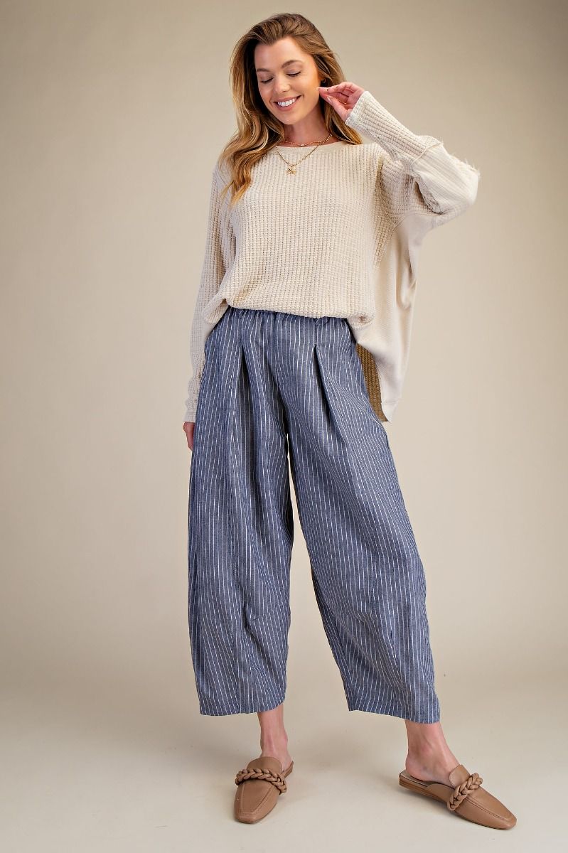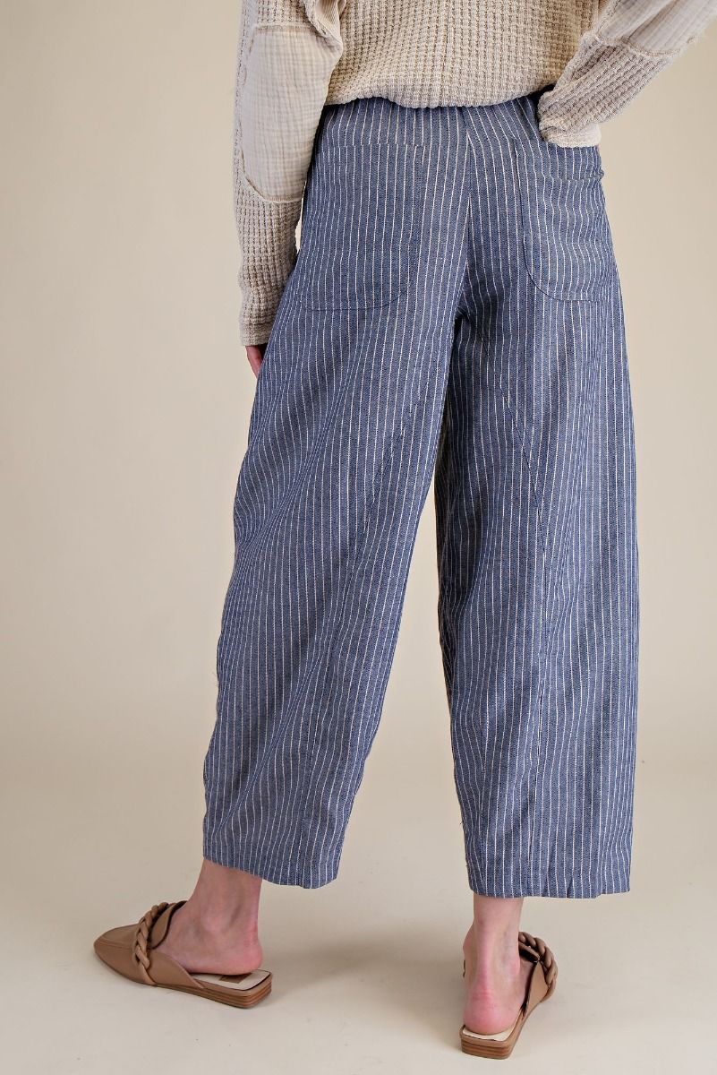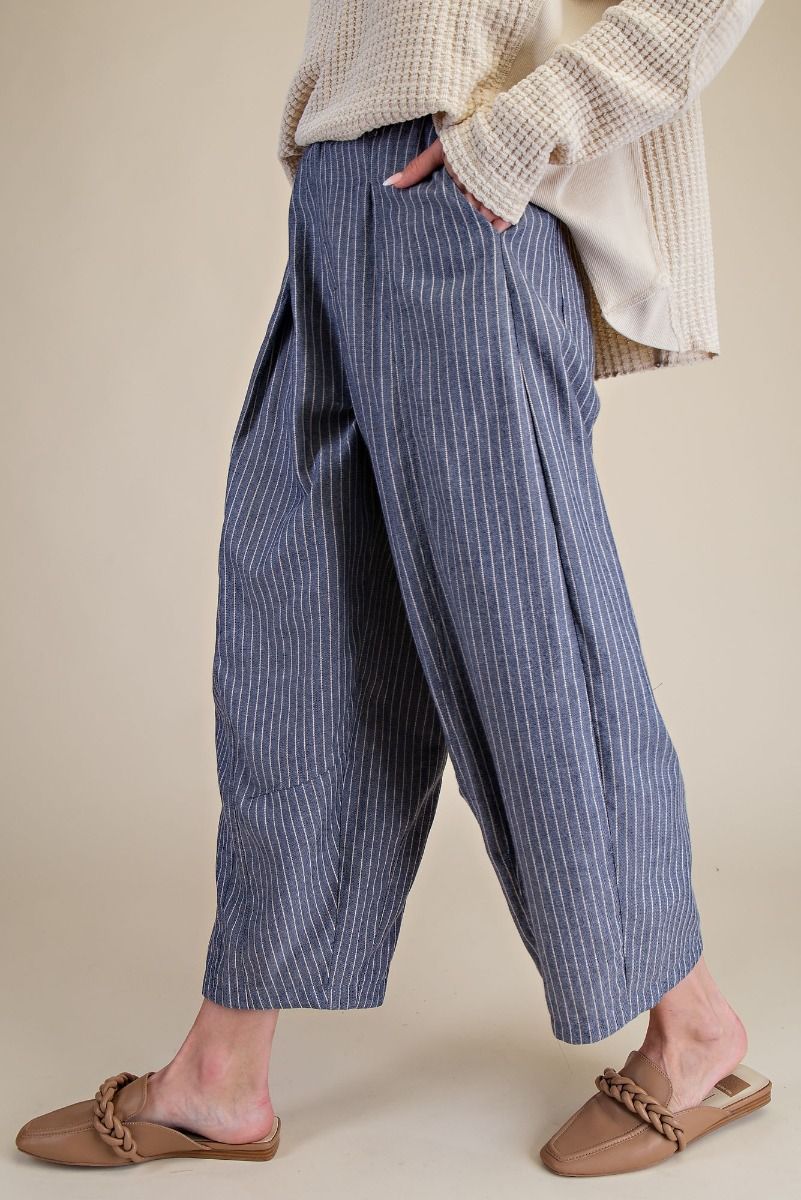 Effortlessly chic and oh-so-comfortable, these striped barrel pants are your new go-to for laid-back style. The relaxed wide-leg silhouette pairs perfectly with the cropped ankle length, while front pleats add just the right amount of volume and movement. High-waisted design flatters your figure, and functional side pockets keep your essentials close. Crafted from a breathable cotton-rayon blend in a timeless vertical stripe, these pants transition seamlessly from casual weekends to easy office days.