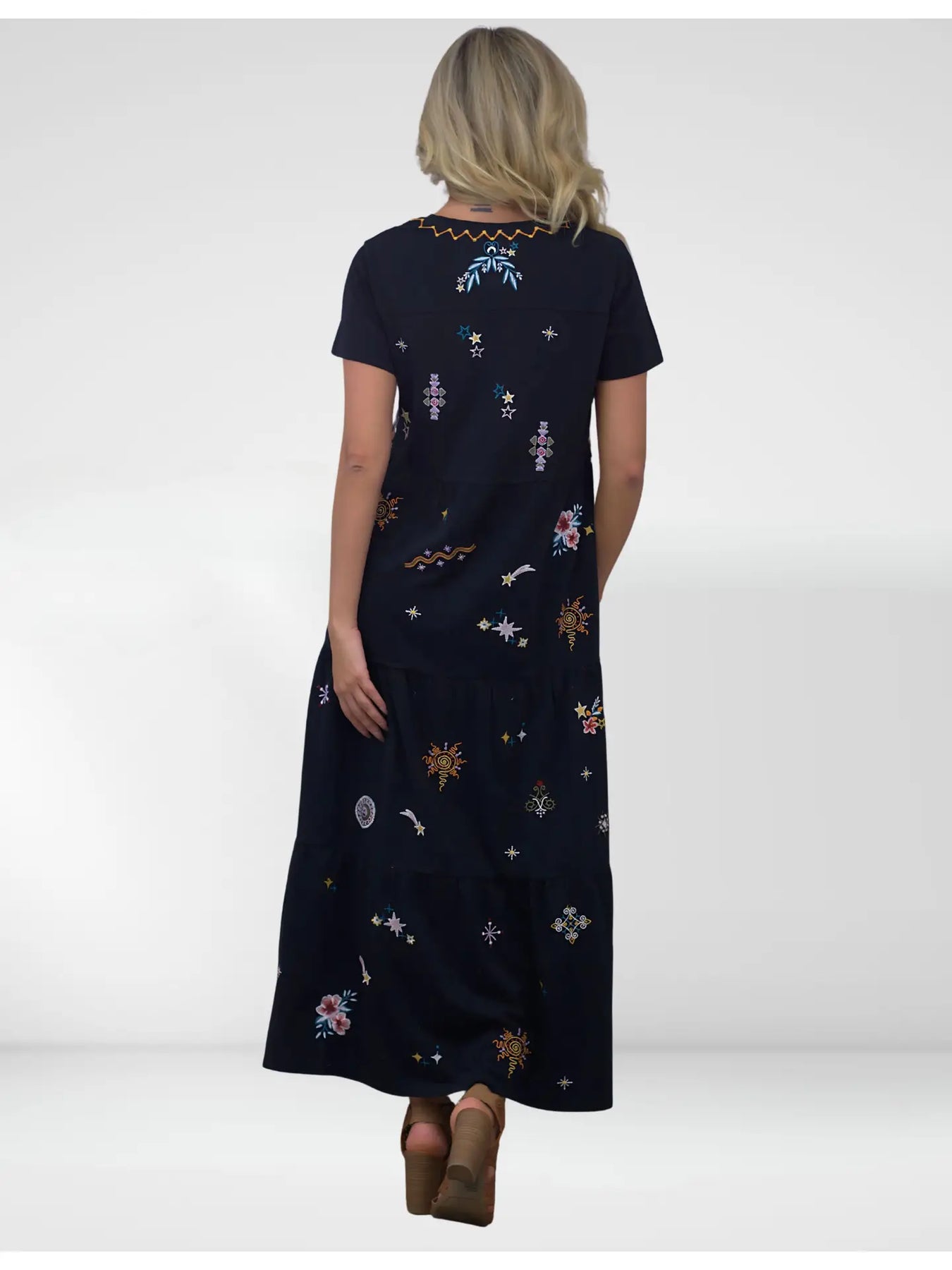 Twirl into comfort with the Sol Knit Embroidered Long Dress by Caite & Kyla Seo—a playful piece that celebrates your unique style. Adorned with charming embroidered flowers, twinkling stars, and delightful designs throughout, this dress brings personality to every wear. The short sleeves keep things breezy, while practical pockets let you carry your essentials in style. Perfect for casual outings or dressed-up occasions, this knit dress combines whimsy with everyday wearability.